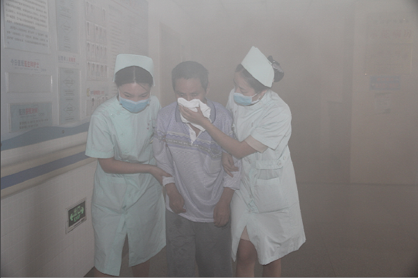 会后,在曾教官的指导下,我院保卫科组织与会人员在内二科病区进行了紧急疏散演练。随着烟雾装置的启用,顿时病区里烟雾弥漫,医护人员们按照疏散路线,有序地指导和协助患者疏散,快速将患者转移到了安全地带。在随后进行的实地灭火演练中,曾教官带头示范,手把手教授灭火技巧,大家轮番上阵展开实战,进一步掌握了灭火技能与方法。