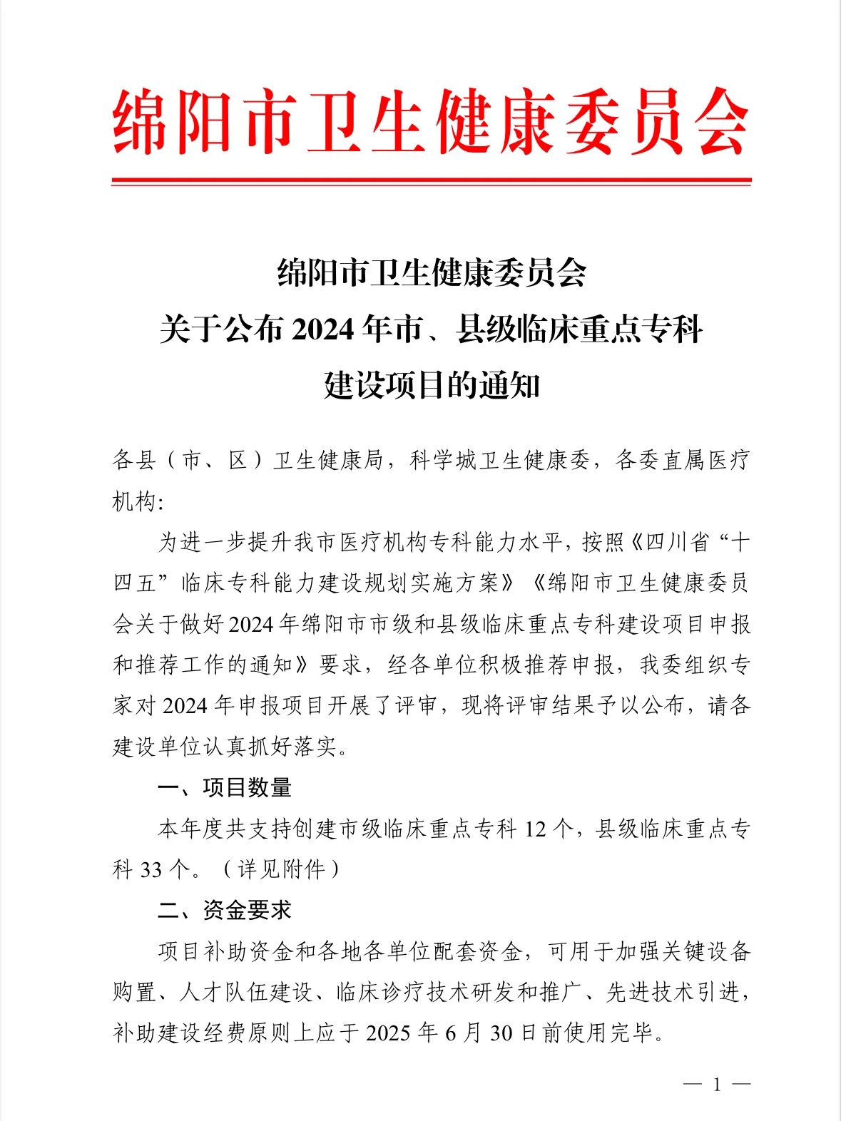 日前,绵阳市卫健委公布了2024年绵阳市临床重点专科建设项目遴选结果,我院呼吸内科、肿瘤科、感染科成功获批绵阳市临床重点专科建设项目。 一直以来,我院将学科建设作为医院内涵提升的重要抓手,从资金配套、设施设备、人才培养、学术创新等方面入手,整合优质医疗资源,大力加强学科建设,全面推动临床诊疗水平和服务能力的提升。目前我院已有省级医学重点专科两个,市级医学重点专科7个。