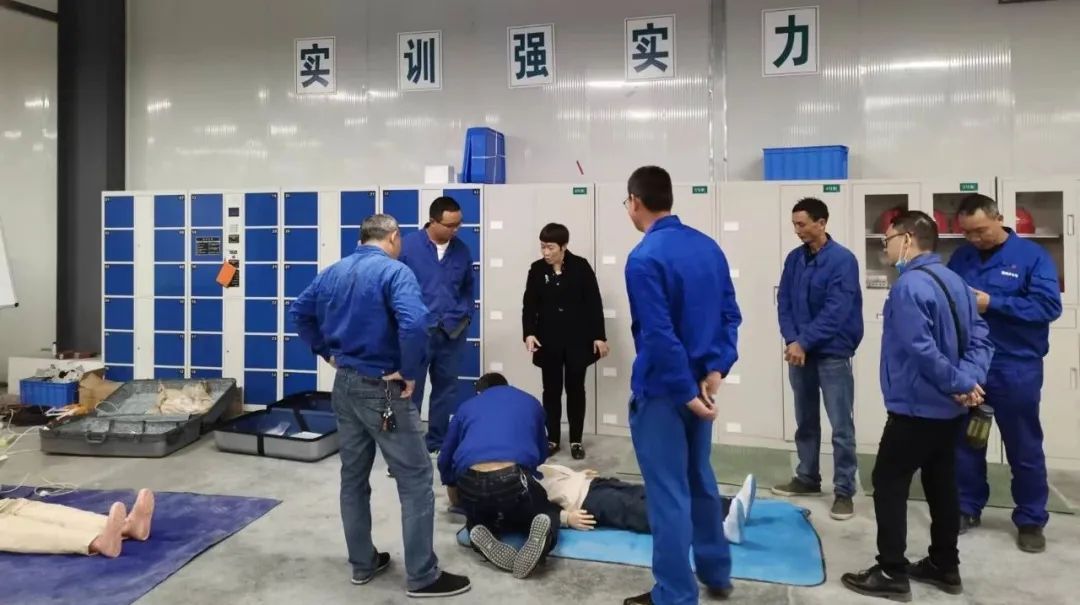 图为急诊科主任杨许莲(左4)为企业员工培训心肺复苏