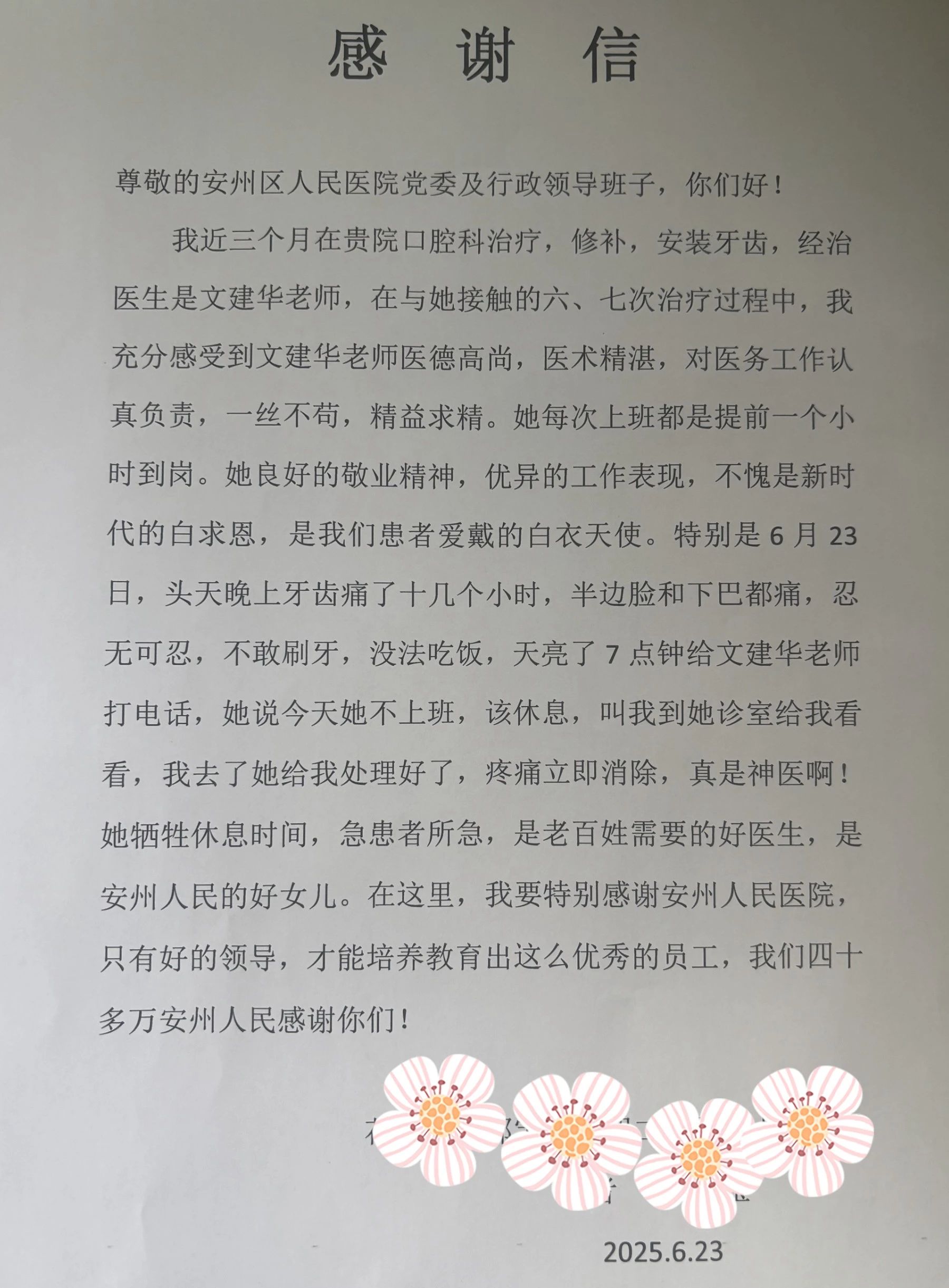 “她是安州人民的好女儿,是老百姓需要的好医生!”近日,花荄镇的曾大叔专程赶到医院,将一封封饱含深情的感谢信送到了医院办公室、口腔科、宣传科,字里行间对口腔科医生文建华的感激与敬佩,揭开了这位“提前一小时到岗”的医者日常。