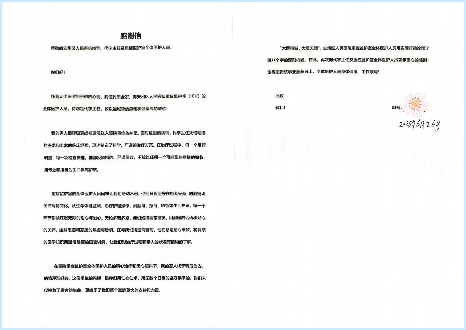 “怀着无比感激与崇敬的心情,向全体医护人员致以最诚挚的感谢!”家属的感谢信,字字句句都是对医护团队的肯定。从危急转入到病情稳定,从恐惧不安到重拾希望,这份跨越生死的信任,正是安州区人民医院ICU“以患者为中心”理念的最佳见证。