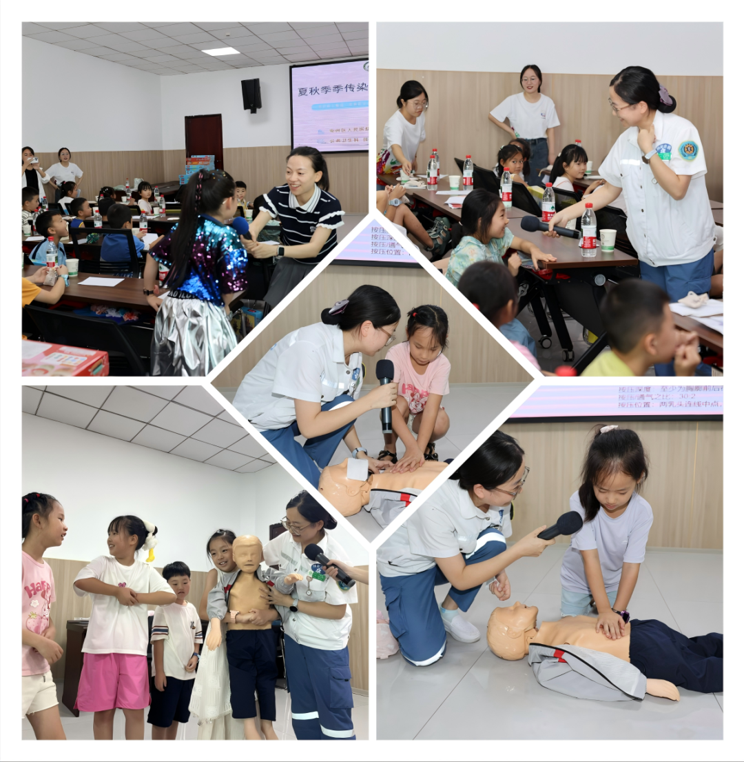 汇报会上不仅有精彩的表演,更有寓教于乐的知识课堂。孩子们认真专注地跟着中药房老师动手制作中草药香囊;聚精会神地聆听公共卫生科老师讲解夏秋季传染病预防知识;在急诊科老师的指导下,积极踊跃地学习急救知识并勇敢上台演练,学习热情高涨,安全意识悄然提升。
